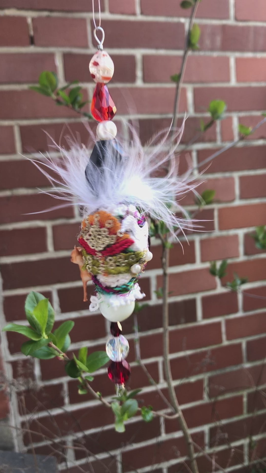 Ein handgemachter Talisman aus Glasperlen, Stoff, Reh-Anhänger, Feder.
